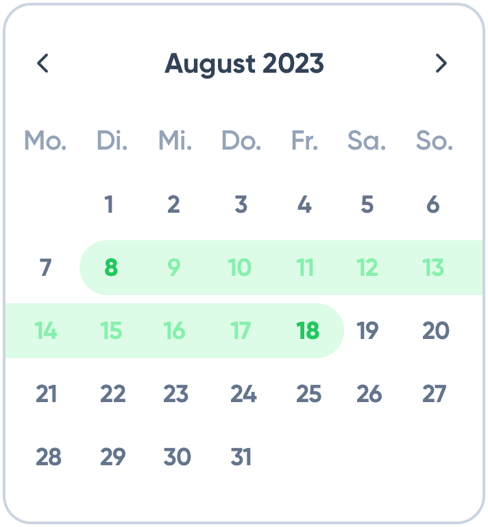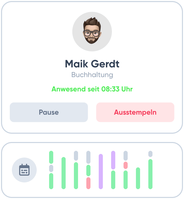 Das Dashboard bietet Ihren Mitarbeitern eine zentrale Ansicht aller wichtigen Daten – von Überstunden bis hin zu genehmigten Urlaubstagen. Mit dem integrierten Kalender können Abwesenheiten leicht geplant und Anwesenheitstage auf einen Blick eingesehen werden.